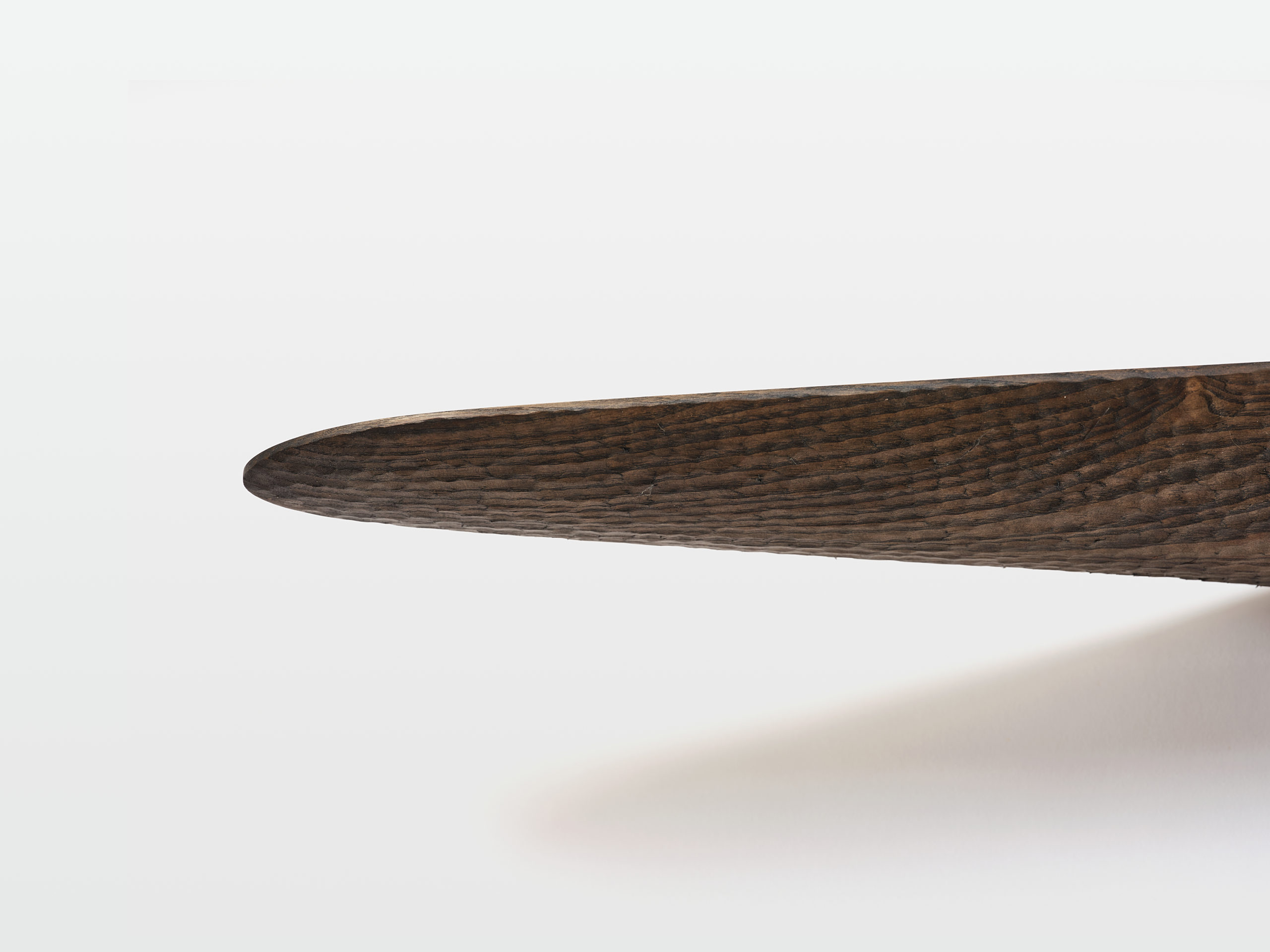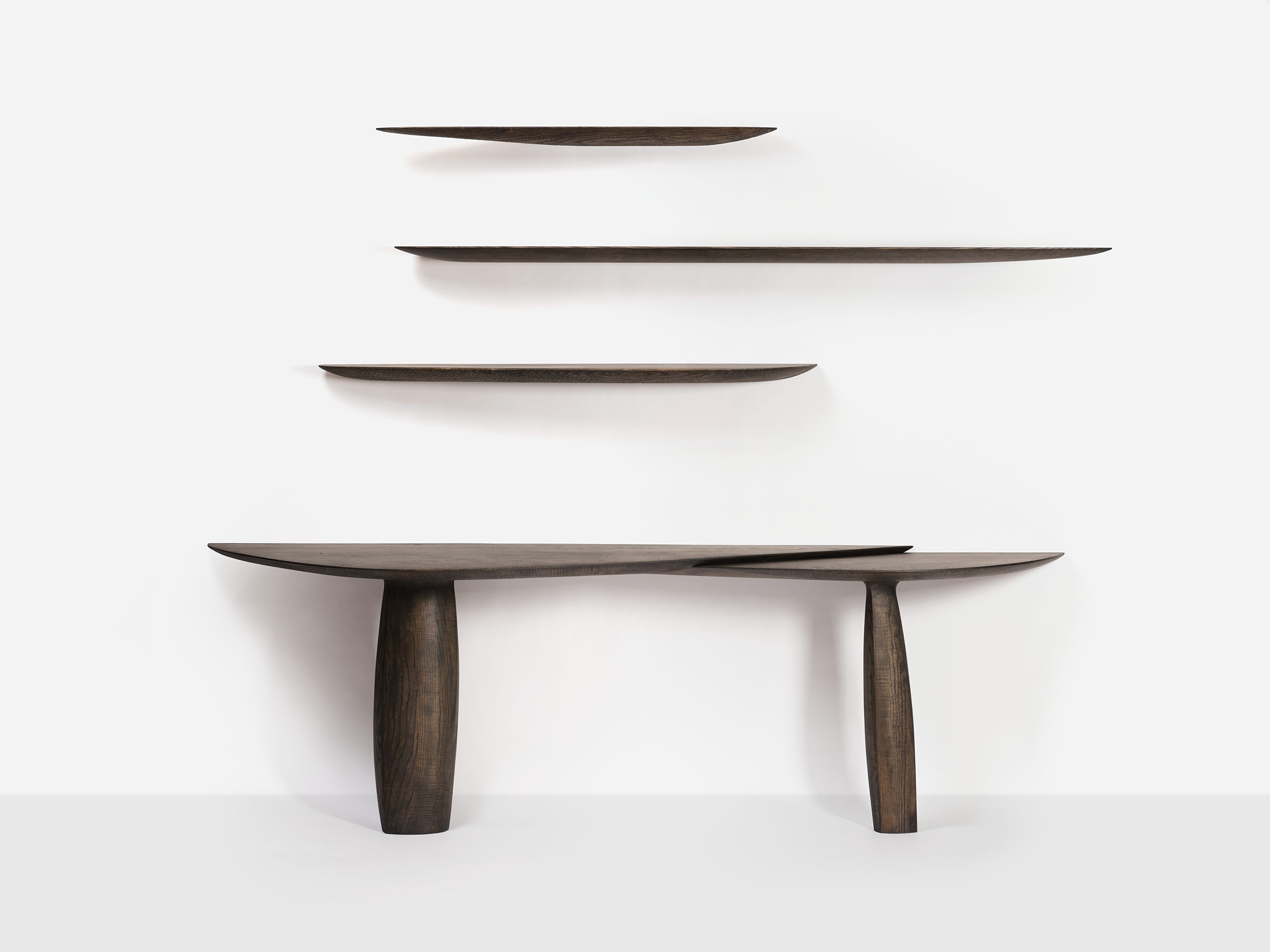 Intéressé par le déplacement des galets le long des côtes de la Manche et par l’inconstance de leur forme au cours de leur voyage, Alexandre Labruyère retranscrit leur mouvement avec son bureau Erosion issue de la série éponyme. Avec cette pièce, il travaille la frêne pour en révêler l’âme et met en tension les lignes pour traduire les effets du temps sur le bois. Le créateur révèle le caractère singulier du matériau en le travaillant selon son veinage et produit un objet sculptural ancré au sol, tel une falaise.
