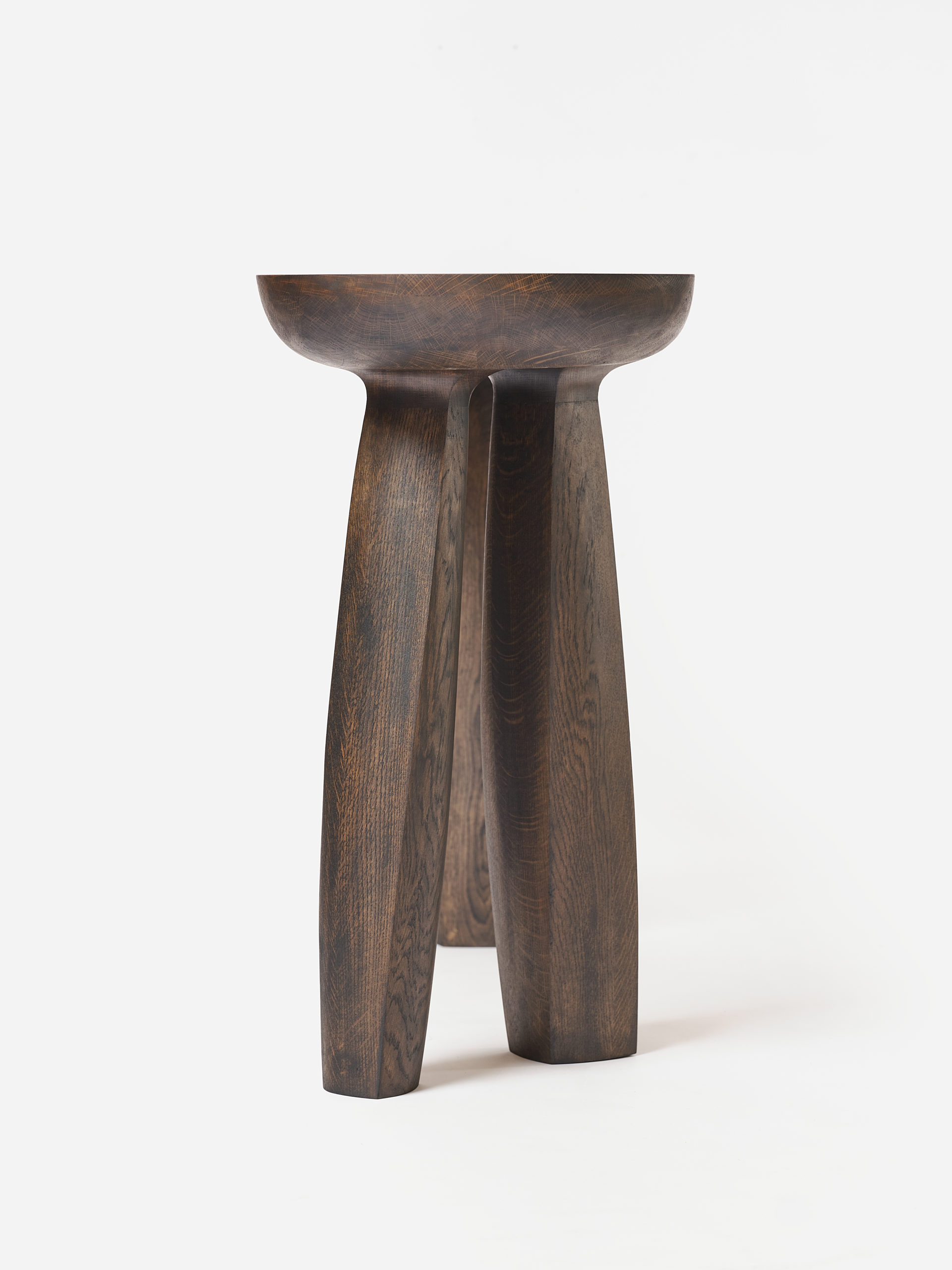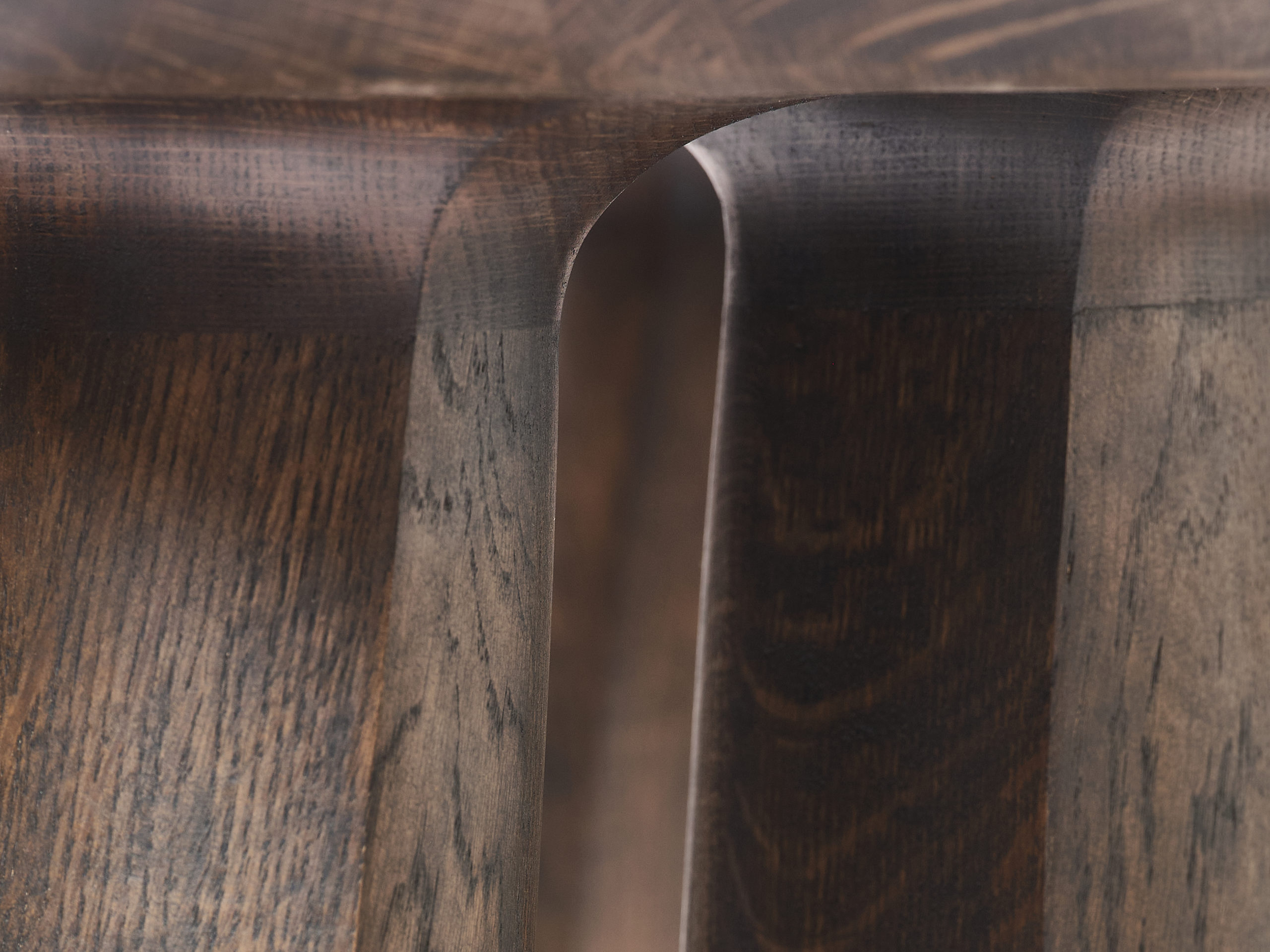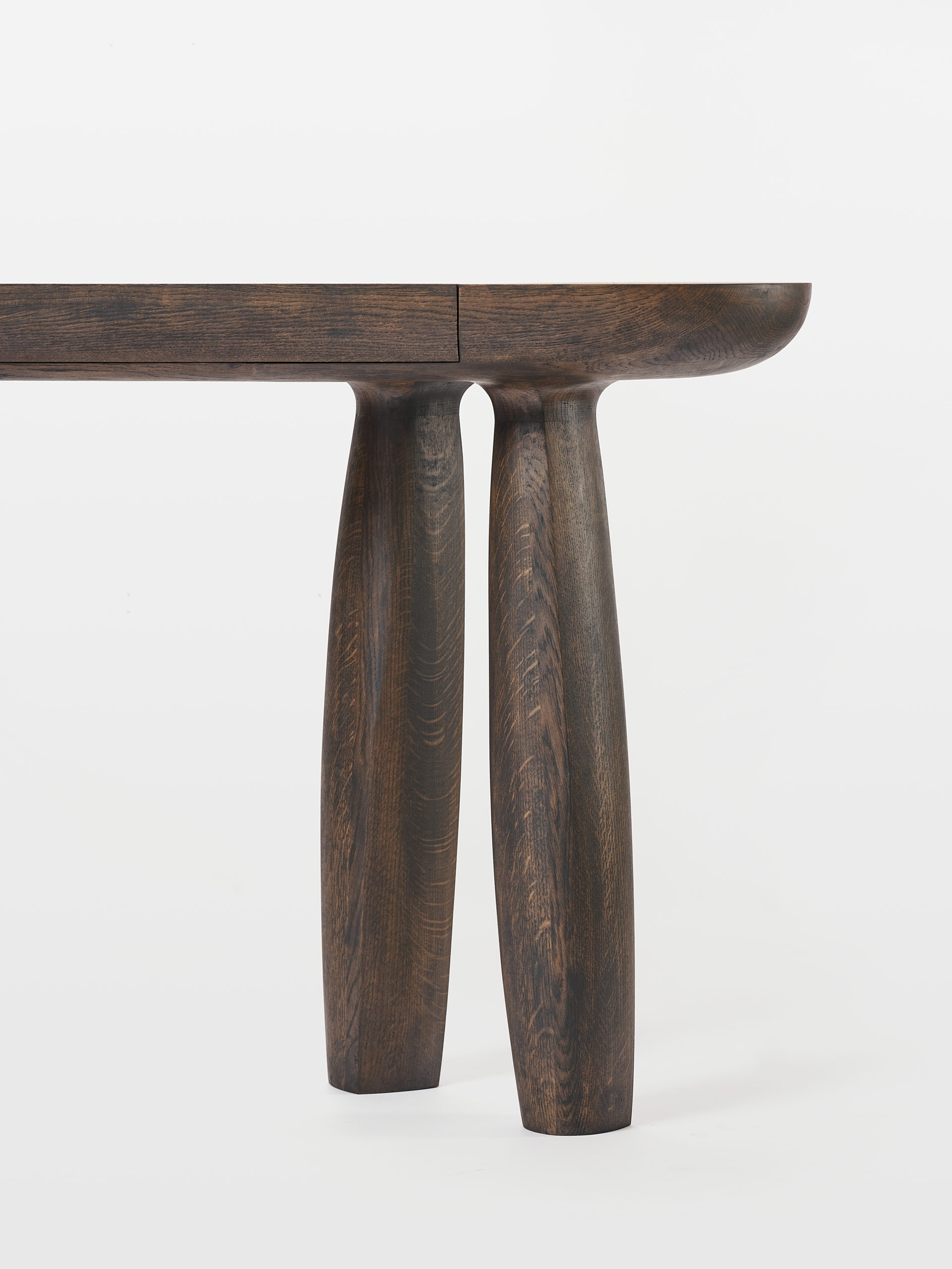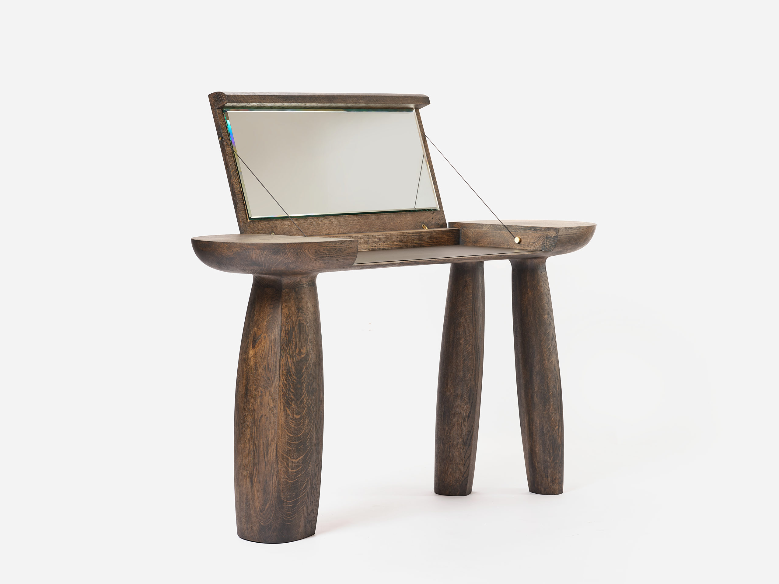 Intéressé par le déplacement des galets le long des côtes de la Manche et par l’inconstance de leur forme au cours de leur voyage. Alexandre Labruyère retranscrit leur mouvement avec sa coiffeuse Erosion issue de la série éponyme. Avec cette pièce, il travaille la chêne pour en révêler l’âme. Il met en tension les lignes pour traduire les effets du temps sur le bois. Le créateur révèle le caractère singulier du matériau en le travaillant selon son veinage et produit un objet sculptural ancré au sol, tel une falaise.