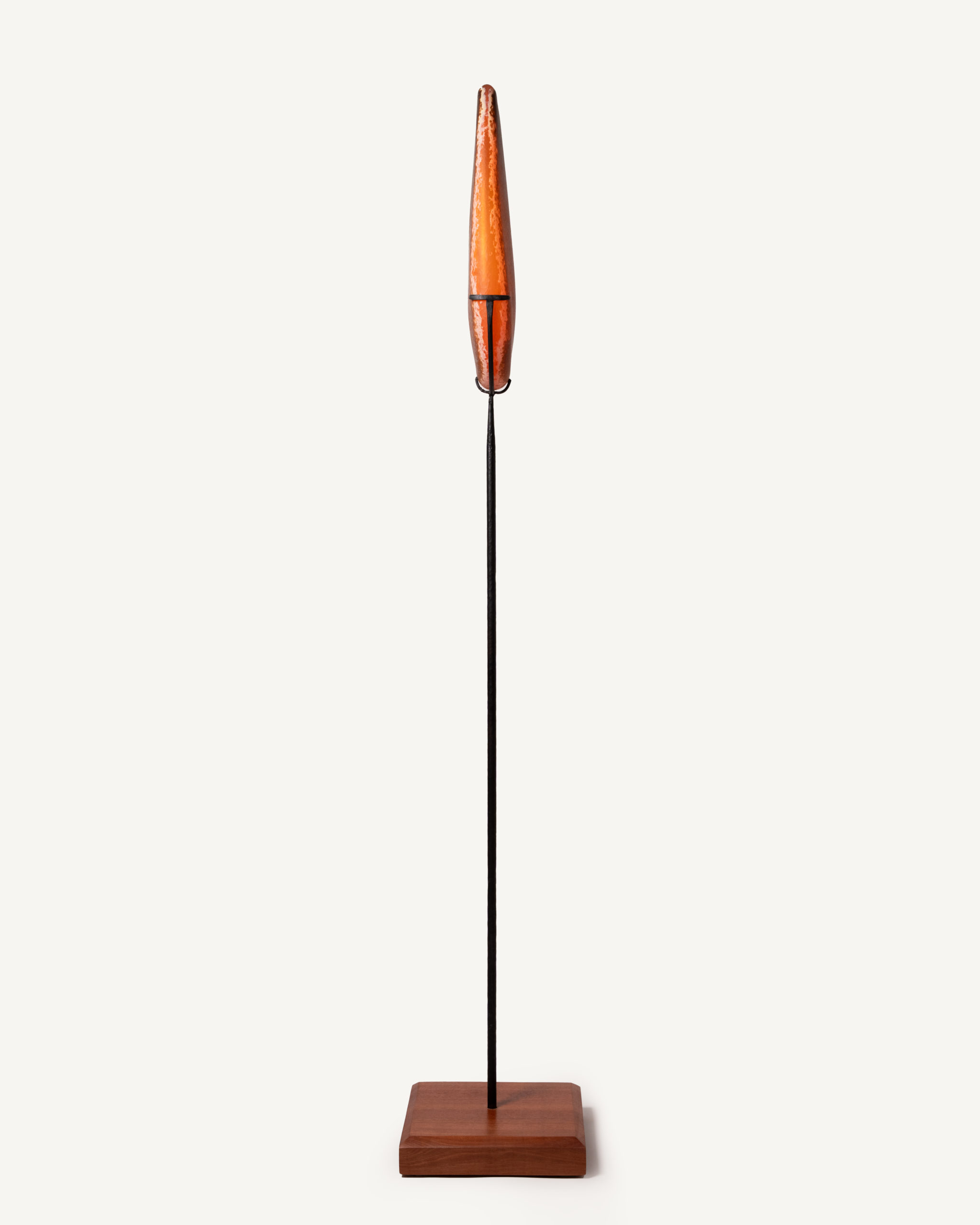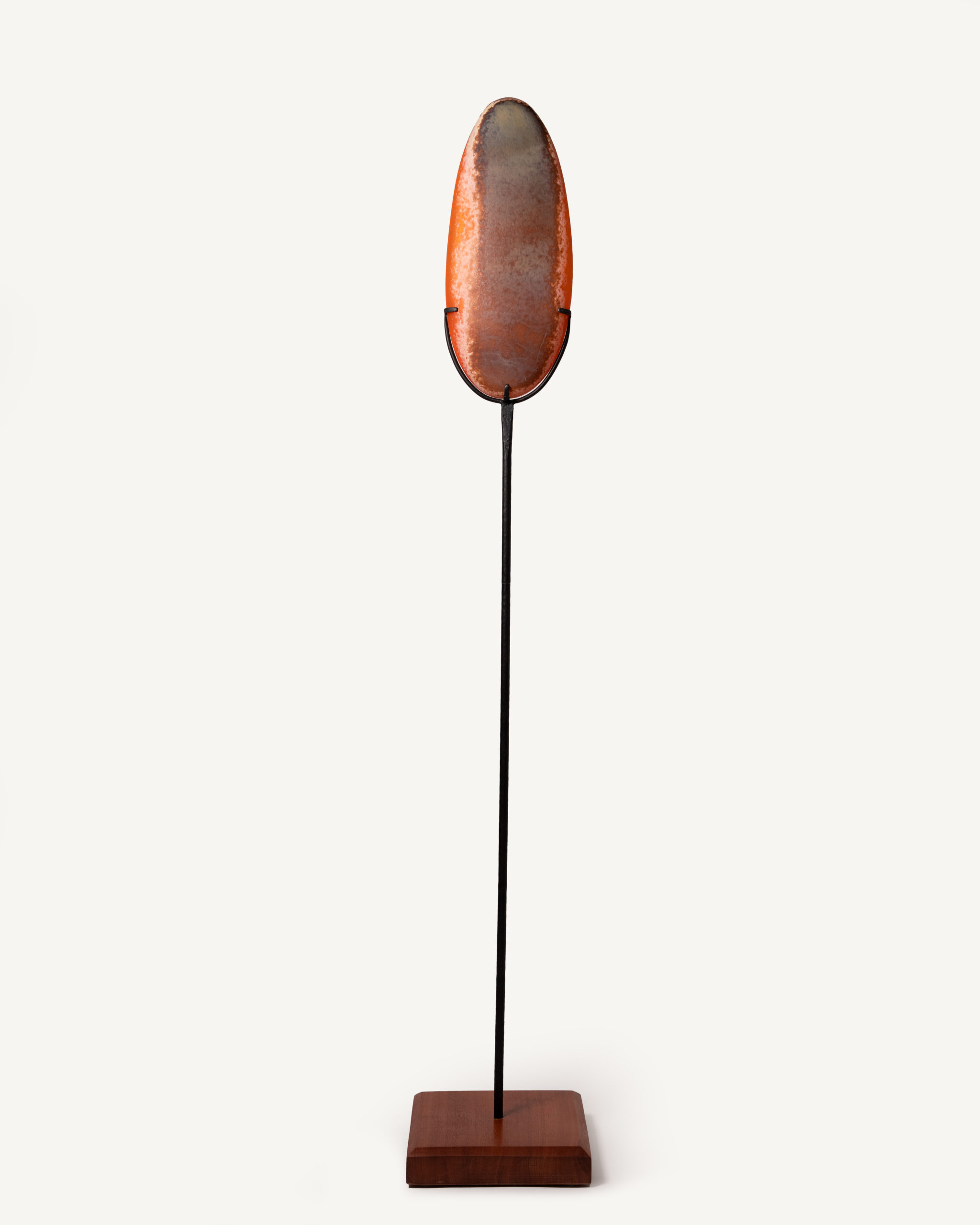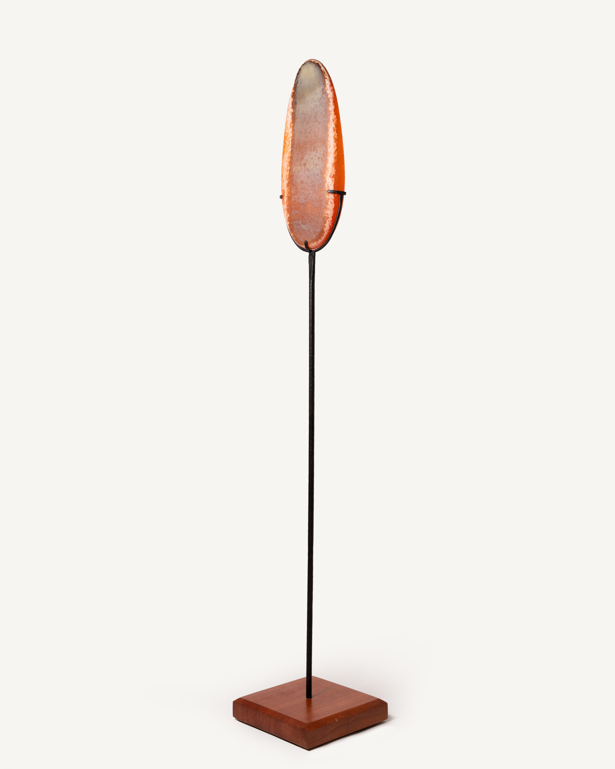 Pour la sculpture de verre « Plume » 3, certains songeront à l’évocation d’une lance. Quand d’autres laisseront divaguer leur esprits vers la plume imaginaire d’un oiseau de Paradis… L’artiste a lui aussi laissé naviguer son esprit d’une rive à l’autre. Libre, élancé, les plumes s’érigent vers le ciel toujours parées des couleurs les plus délicates.