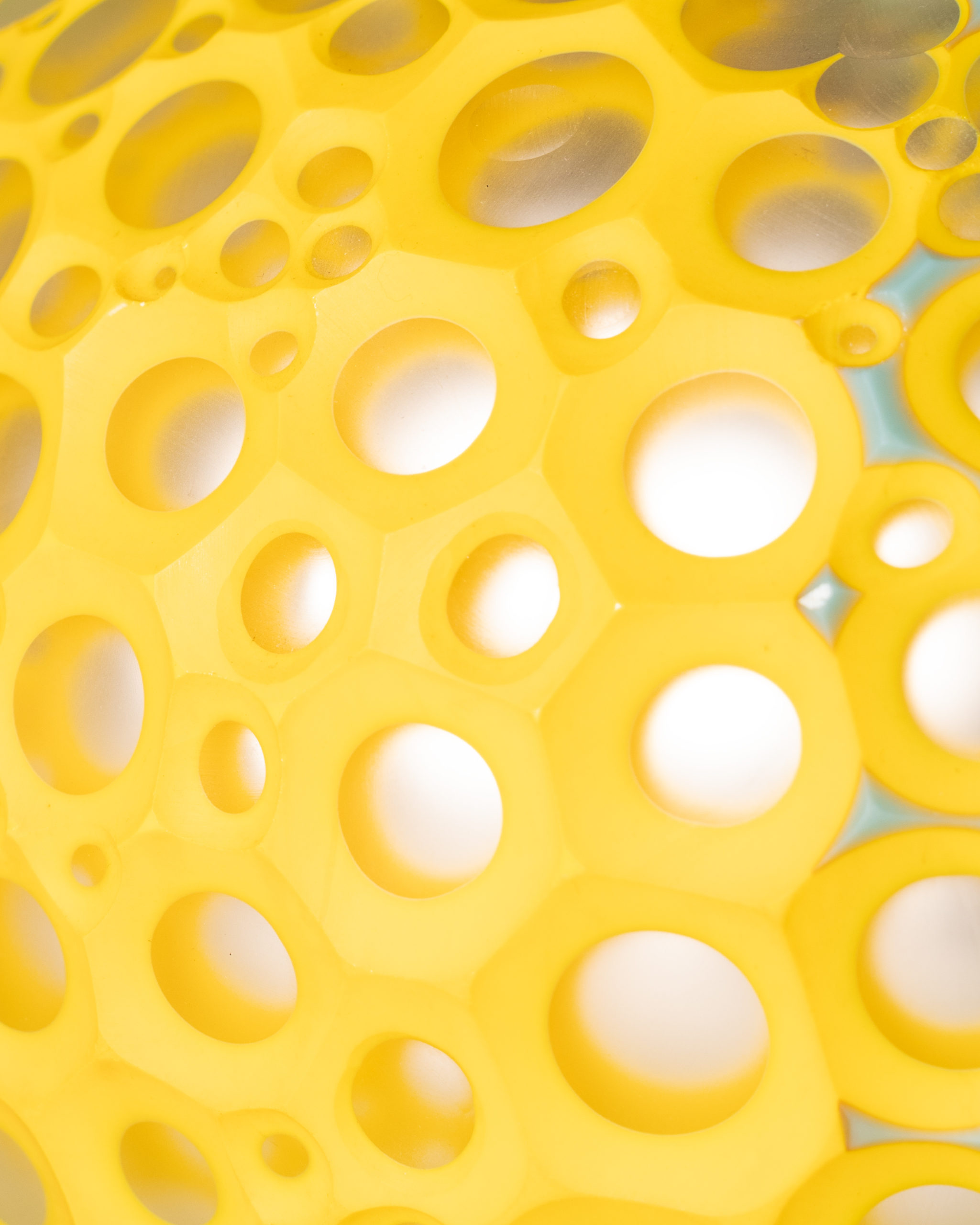de textures et de nuances. Mais c’est sous lumière noire que l’oeuvre dévoile toute sa singularité : le verre uranium réagit et se met à émettre une lueur phosphorescente, transformant la sculpture en une