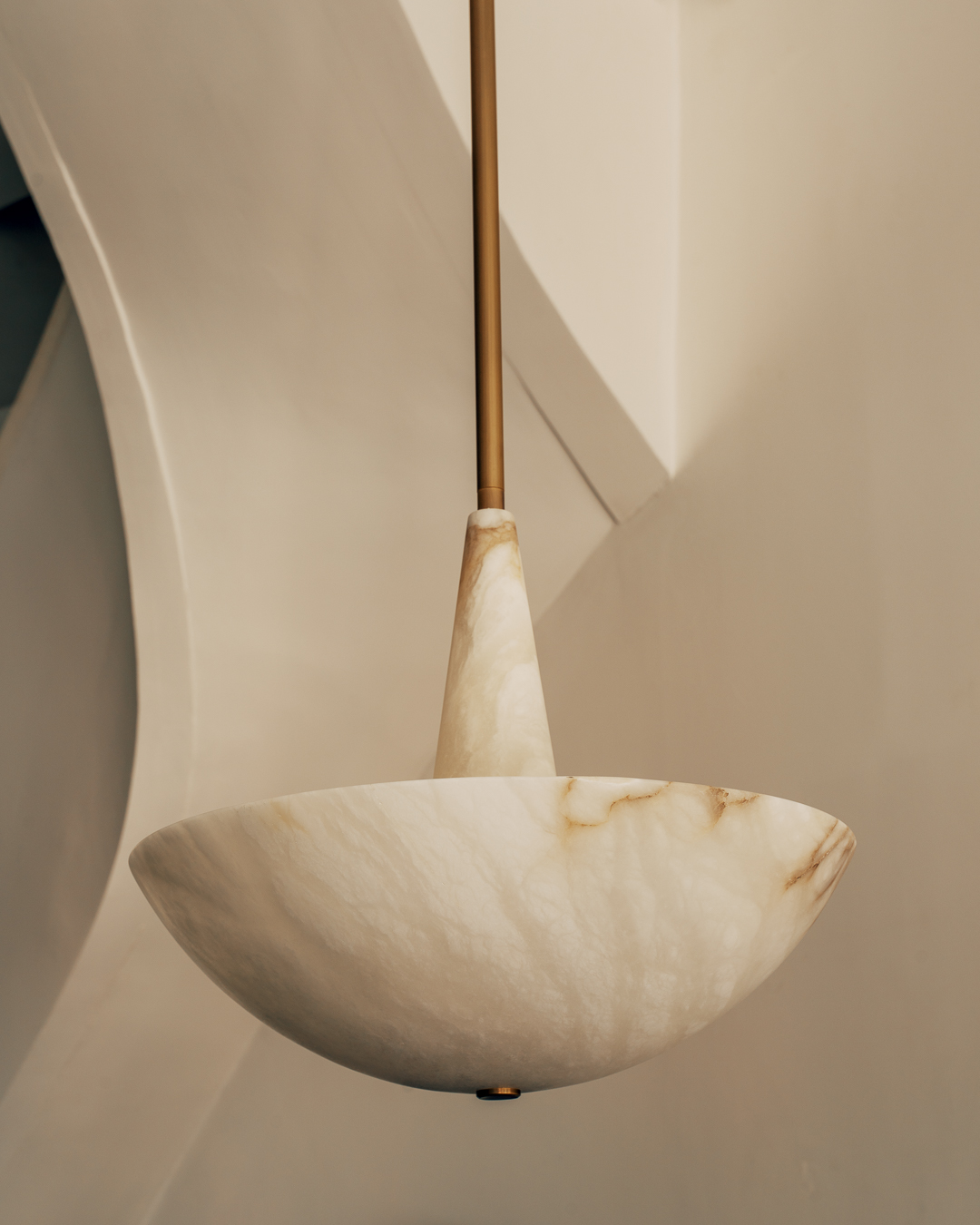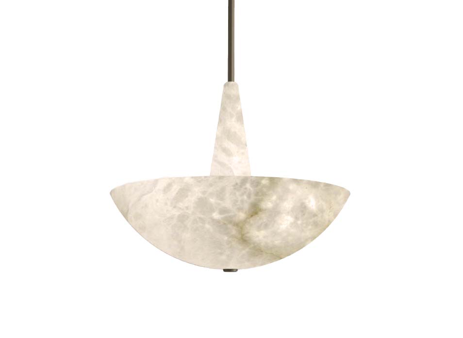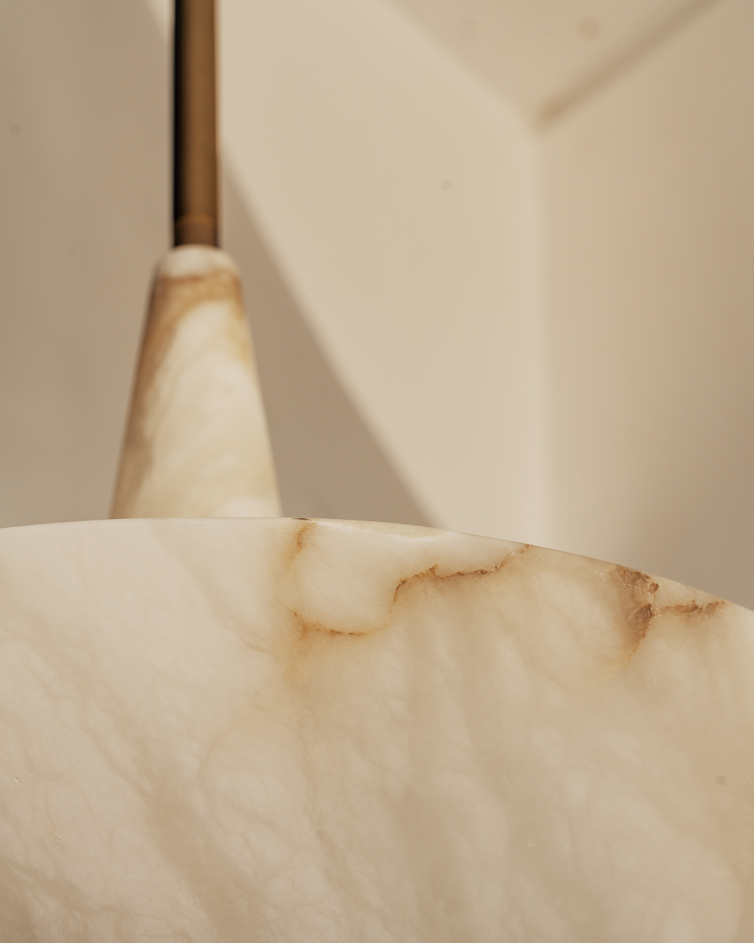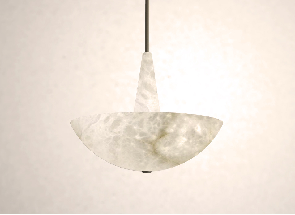 Ce luminaire a été conceptualisé par Garnier & Linker en 2018. Cette suspension est composée d’un abat-jour en albâtre suspendu par une tige de laiton patiné de couleur naturelle foncée, dont la hauteur peut être choisie sur mesure.