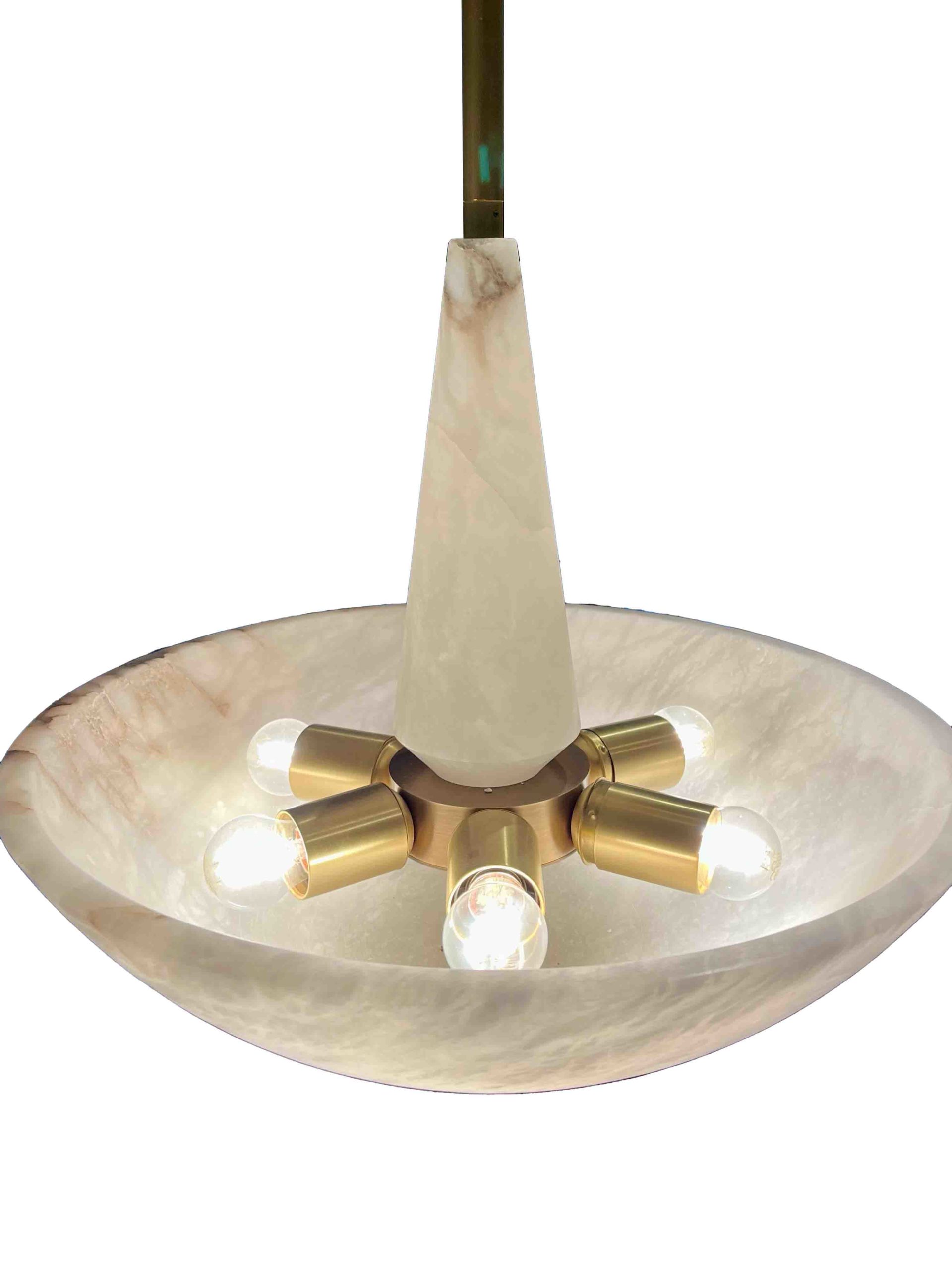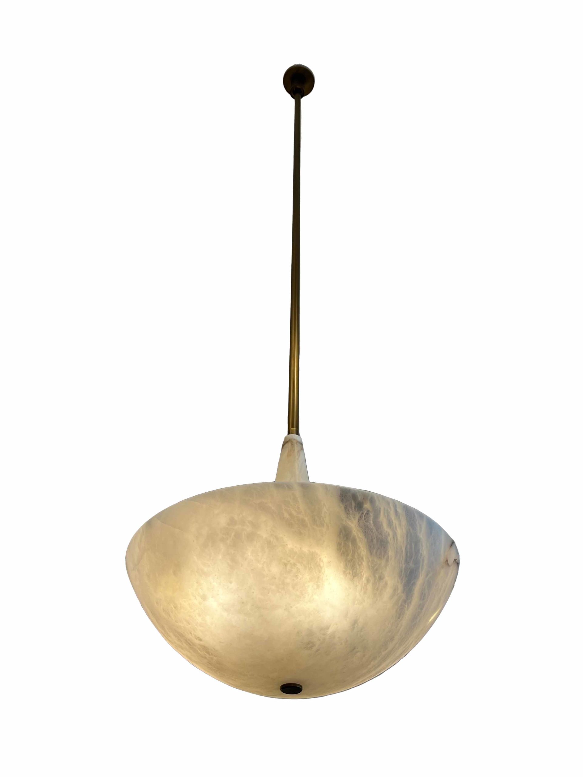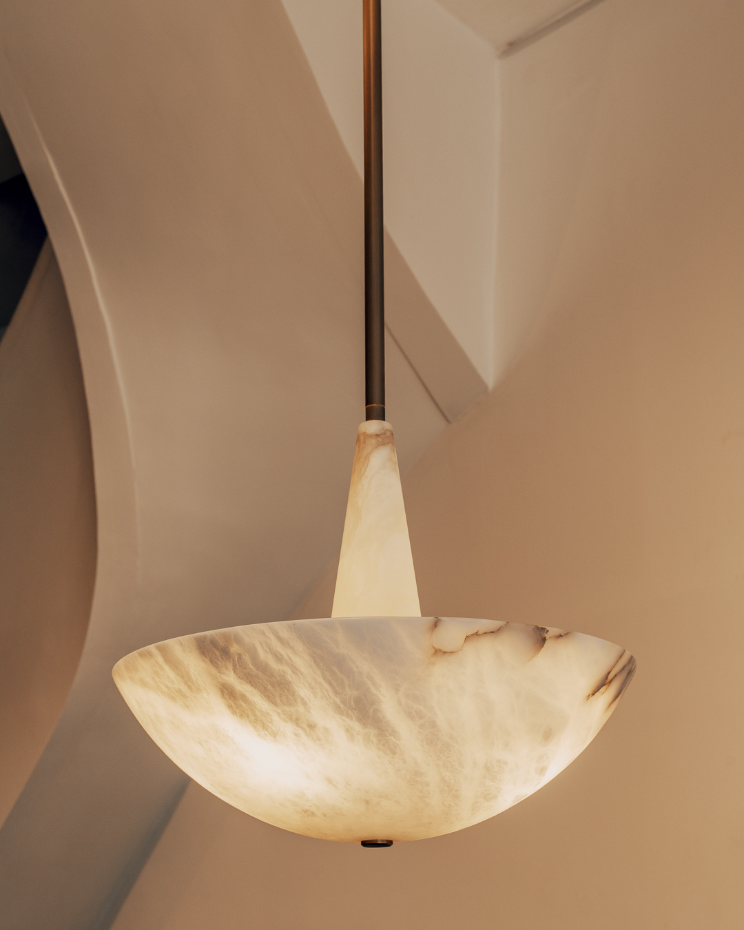 Ce luminaire a été conceptualisé par Garnier & Linker en 2018. Cette suspension est composée d’un abat-jour en albâtre suspendu par une tige de laiton patiné de couleur naturelle foncée, dont la hauteur peut être choisie sur mesure.
