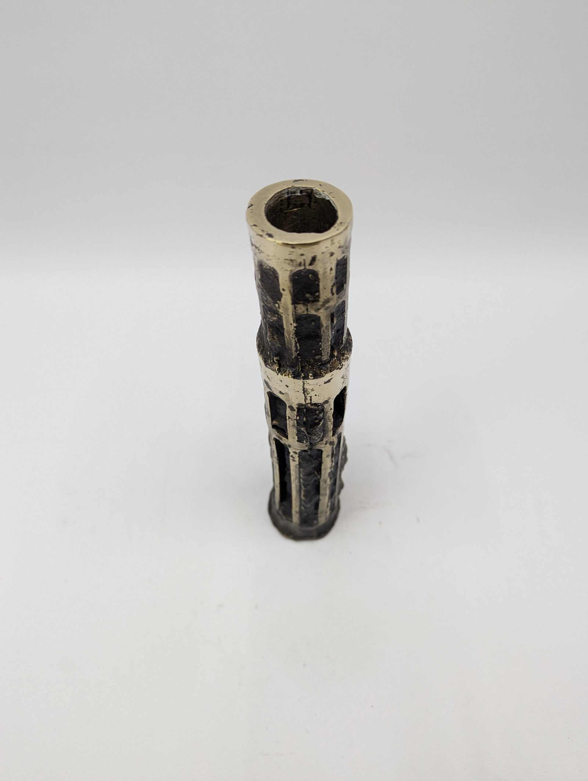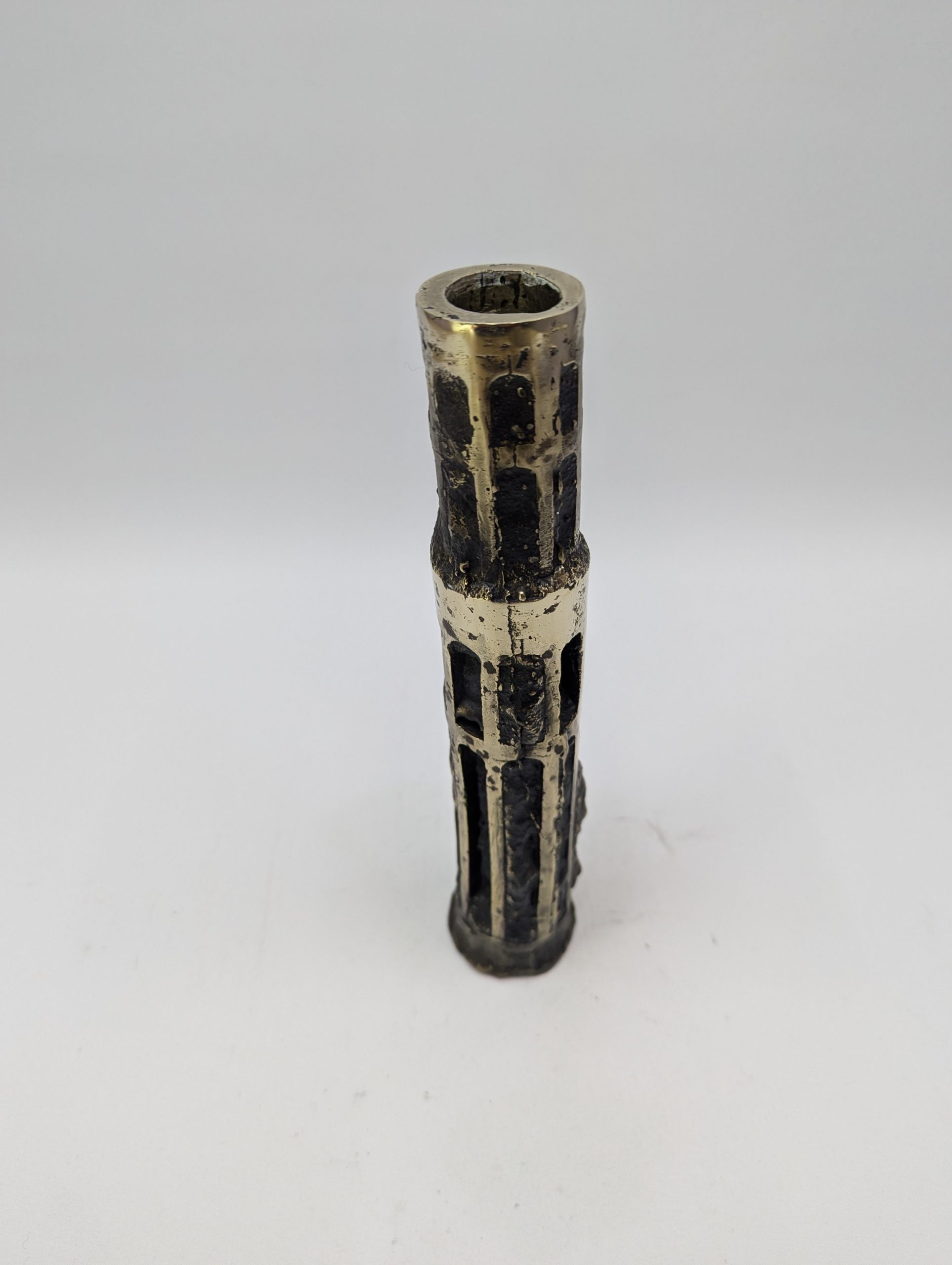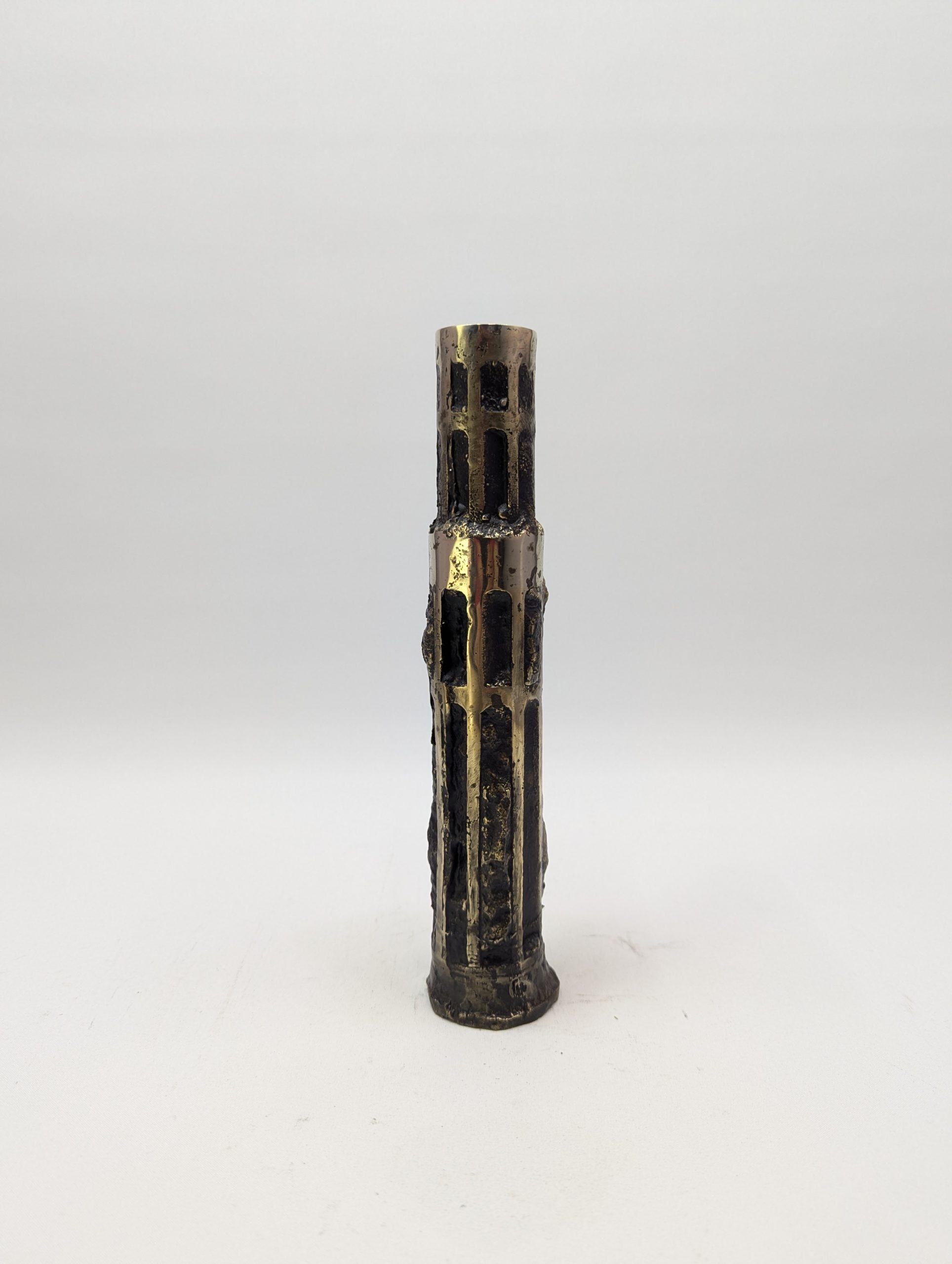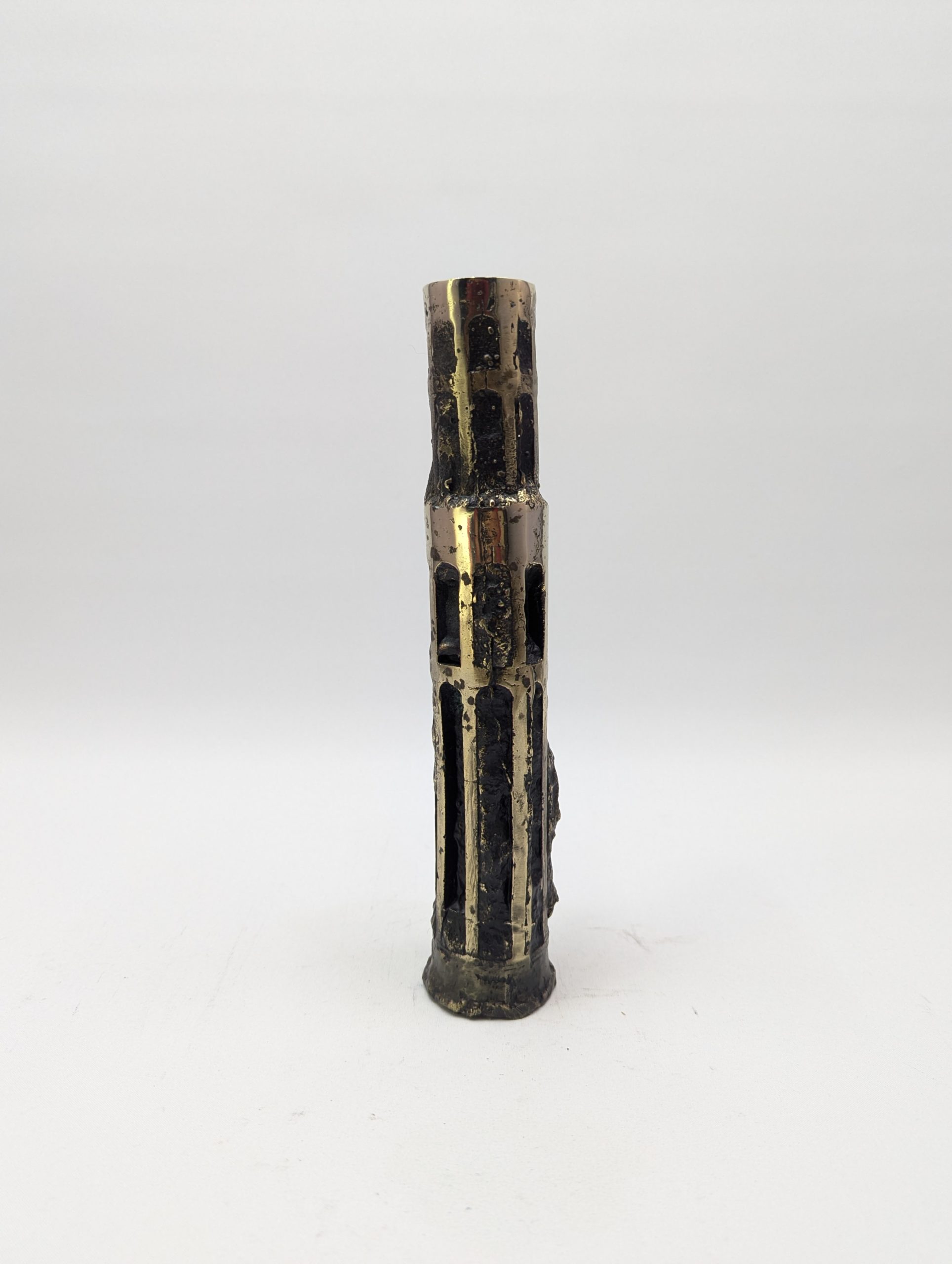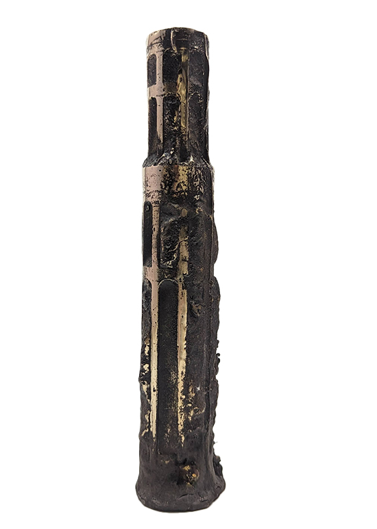 Vase Vendôme crée par Fabien Barrero-Carsenat en 2023. Ce vase est en bronze. La patine sombre, nuancée de reflets brun et doré, accentue les creux et les aspérités du bronze, créant un jeu subtil de lumière.